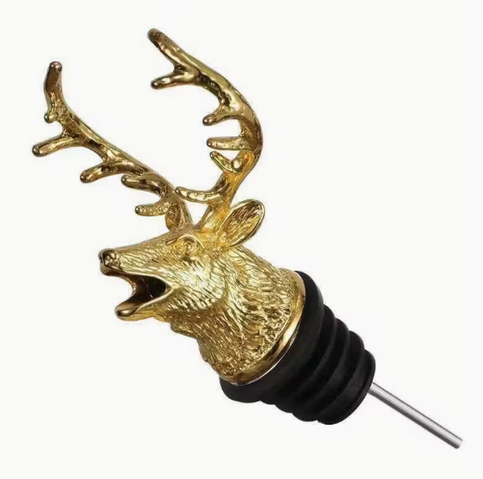 Stilingas ir išskirtinis butelio piltuvėlis, papuoštas auksinės spalvos elnio galva su ragais. Tai ne tik praktiška priemonė pilti gėrimus be lašėjimo, bet ir įspūdinga stalo ar baro detalė.