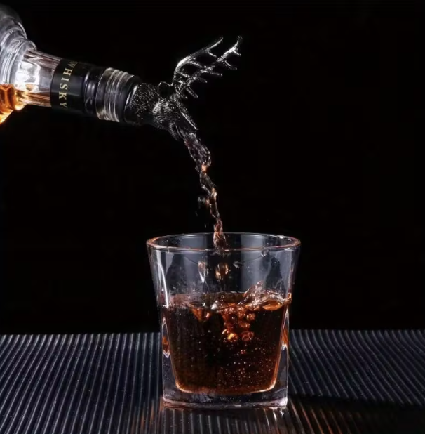 Stilingas ir išskirtinis butelio piltuvėlis, papuoštas sidabrinės spalvos elnio galva su ragais. Tai ne tik praktiška priemonė pilti gėrimus be lašėjimo, bet ir įspūdinga stalo ar baro detalė.