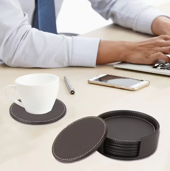 Dirbtinės odos, rudi padėkliukai 6 vnt. su stoveliu.