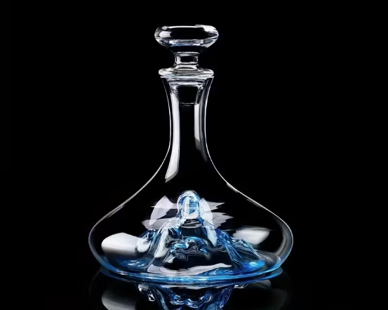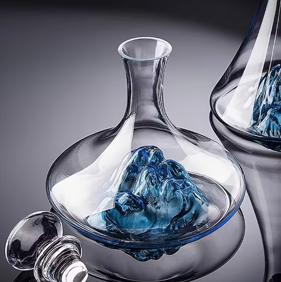 Išskirtinio dizaino krištolinis grafinas, kurio dugne – kalnų formos dekoras, suteikiantis prabangos ir išskirtinumo įspūdį. Talpus ir elegantiškas, jis puikiai tinka vynui, viskiui, brendžiui ar kitiems gėrimams dekantuoti ir stilingai patiekti.