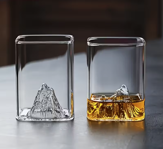 Išskirtinio dizaino kvadratinės viskio taurės su kalnų formos dugnu – puikus pasirinkimas tiems, kurie mėgsta stilių ir originalumą. Skaidrus stiklas leidžia gėrimui atsiskleisti visu grožiu, o kalnų reljefas sukuria įspūdingą vaizdą, ypač užpildžius gintarinio viskio ar kito gėrimo.