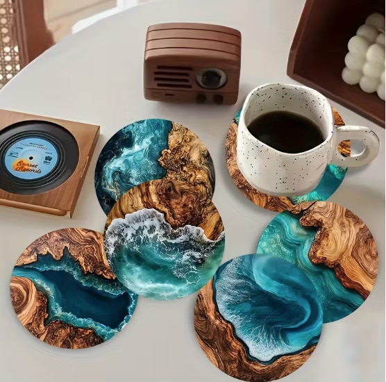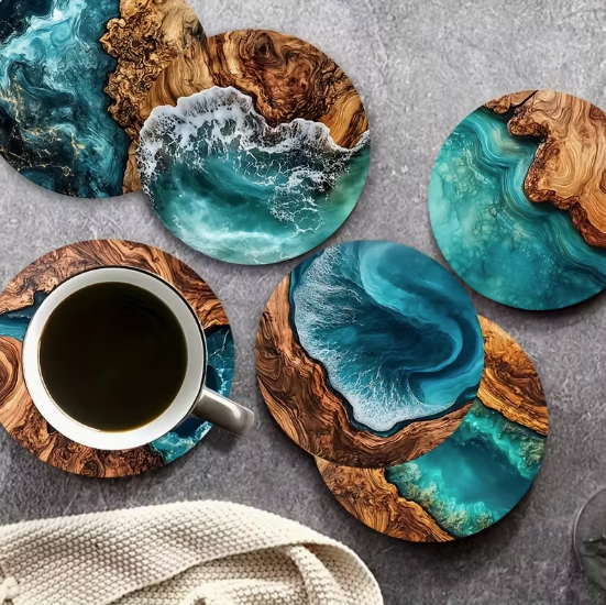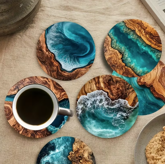 Stilingi apvalūs padėkliukai su įspūdingu vandenyno motyvu – puiki interjero detalė, apsauganti jūsų stalą nuo karščio, drėgmės ir įbrėžimų. Kiekvienas padėkliukas dekoruotas unikaliu dizainu, primenančiu jūros bangas ir medžio tekstūrą.