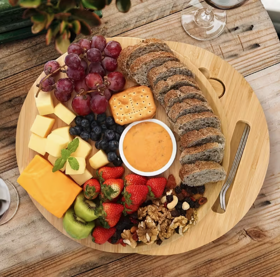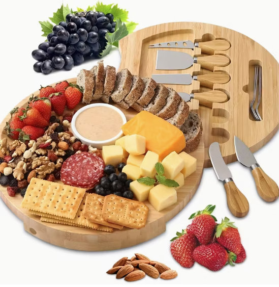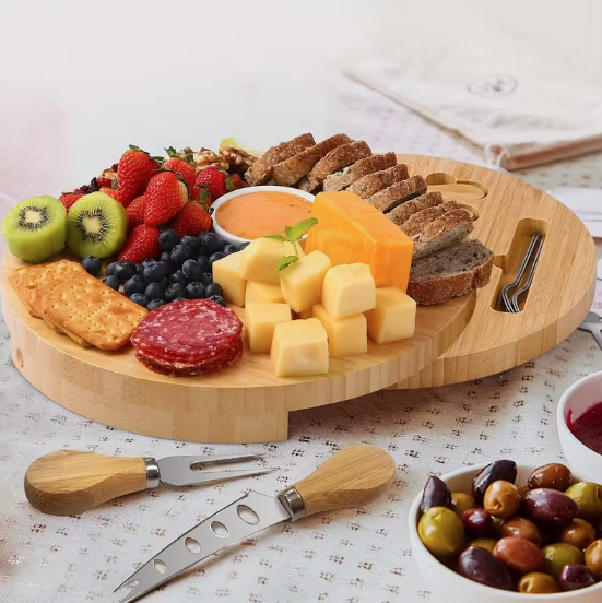 Elegantiškas, apvalus užkandžių padėklas, skirta stilingam sūrių, mėsos užkandžių, vaisių ir riešutų pateikimui. Komplekte yra stalčiuje paslėpti nerūdijančio plieno įrankiai su medinėmis rankenomis – peiliai, šakutės ir mentelės patogiam serviravimui.