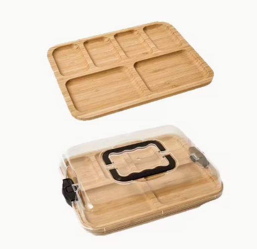 Užkandžių padėklas su skyreliais ir dangčiu.