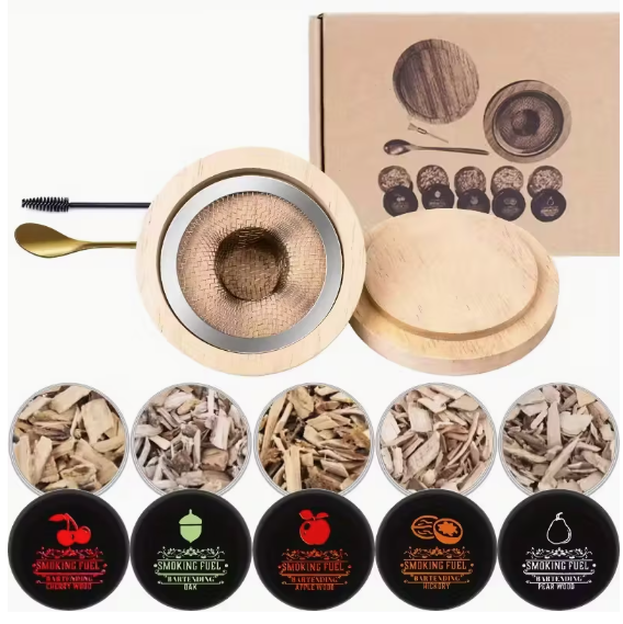 Viskio ir kitų gėrimų rūkymo rinkinys su apvalia rūkykla ir 5 skoniais.