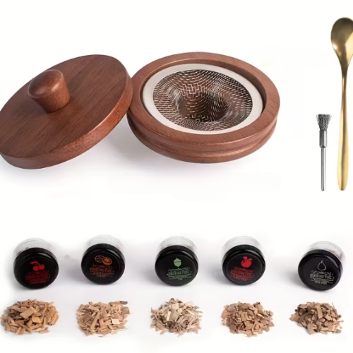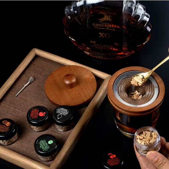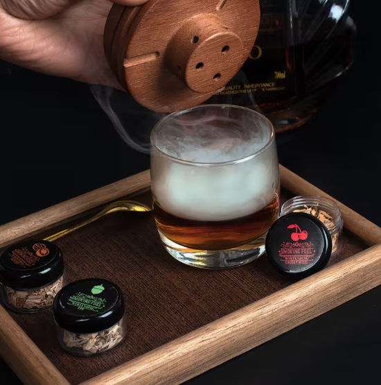 Viskio ir kitų gėrimų rūkymo rinkinys su tamsiai ruda, apvalia, rūkykla ir 5 aromatais